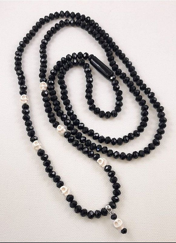 Descubra a poderosa energia do Guia Exu Caveira, uma joia artesanal confeccionada com cristais de vidro na elegante tonalidade preta e caveiras esculpidas em pedra natural branca, pronta para proteger e fortalecer suas conexões espirituais.