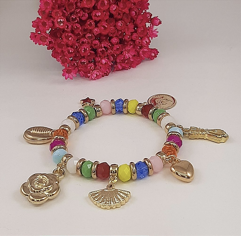 Pulseira Cigana com cristais de vidro muito colorida, com moedas e metais em banho flash.
