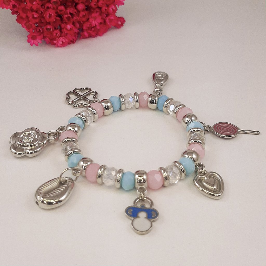 Pulseira Berloqueira para Erê / Cosme e Damião com cristais de vidro, e 7 pingentes.